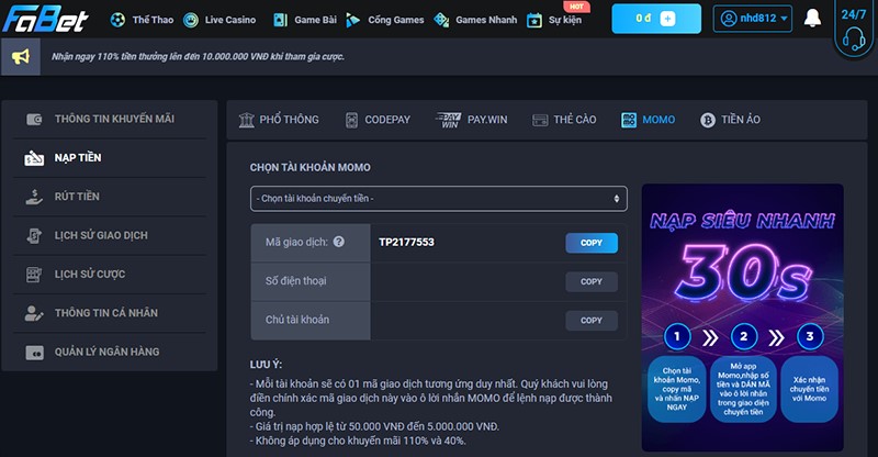 Anh em hãy copy số điện thoại, mở ứng dụng momo lên và pass vào. Sau đó, hãy điền số tiền mà bạn muốn nạp vào tài khoản. Đồng thời, nhớ chèn thêm đoạn mã giao dịch nữa nhé. Sau khi chuyển khoản thành công thì tài khoản của bạn sẽ được hệ thống cộng đủ số tiền vừa nạp