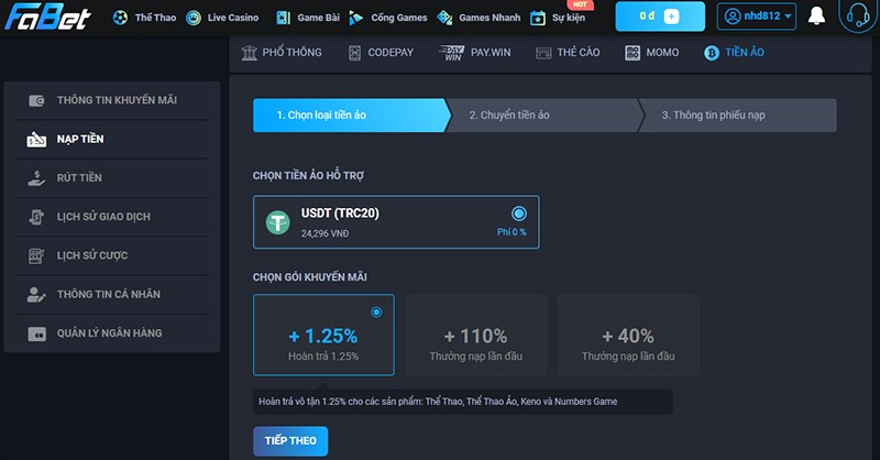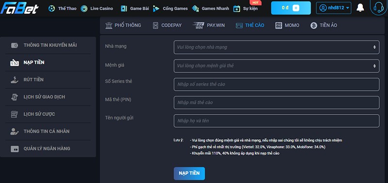 Nhà cái FABET hỗ trợ phương thức nạp tiền. Hiện tại, chúng ta sẽ có 6 lựa chọn bao gồm như: Nạp phổ thông; CodePay; PayWin; Thẻ cào; Ví momo; Tiền ảo