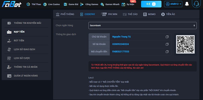 - Bước 2: Thông tin STK ngân hàng bên FABET sẽ hiển thị lên. Anh em chỉ việc dùng điện thoại và quét mã CodePay.