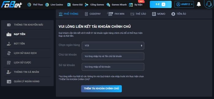 - Bước 2: Lấy thông tin STK ngân hàng của FABET.